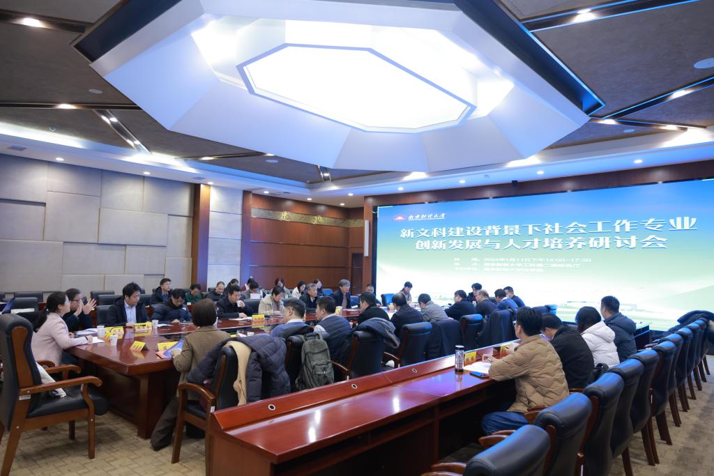 2024年1月11日下午,草莓视频 在工科楼二楼会议室,召开了“新文科建设背景下社会工作专业创新发展与人才培养”研讨会。会议围绕新时代社会工作发展前景与办学定位、社会工作专业特色与人才培养模式、专业课程体系完善与人才培养方案优化等主题展开研讨。校外与会专家有中国社会工作教育协会副会长、南京大学社会学院彭华民教授,以及来自南京大学、东南大学、河海大学、南京师范大学、南京理工大学、南京航空航天大学、南京农业大学、苏州大学、南京邮电大学、江苏师范大学、江苏省社科院社会学所以及江苏省委党校等高校和科研院所的社会工作专业负责人。校内与会专家有:校党委常委、纪委书记李茜,党委学生工作部部长、学生处处长韩力争,法制办副主任(主持工作)吴庚祐,学科建设办公室、高水平建设办公室副主任胡唐明,教务处副处长、实验实践教学管理中心主任万兴,宣传部副部长龚莉红,草莓视频 党委书记黄建国、院长胡宜奎、副院长蔡养军、副院长陈红梅、社工系全体教师以及校友代表。草莓视频 党委书记黄建国主持了开幕式环节。