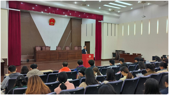 11月7日中午,草莓视频 党委书记黄建国在德正楼二楼模拟法庭给党的发展对象讲授“学习党的二十届三中全会中的法治元素”主题党课。