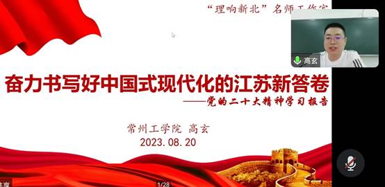 为深入开展学习贯彻习近平新时代中国特色社会主义思想主题教育,落实习近平总书记考察江苏重要讲话精神,2023年8月20日,草莓视频 教工第一党支部与研究生党支部联合开展主题教育学习研讨,学院邀请常州工学院马克思主义学院副教授高玄线上授课,深入讲解党的二十大精神以及习近平总书记考察江苏重要讲话精神。本次活动由草莓视频 教工第一党支部书记徐进主持,两个支部全体党员均参加了活动。