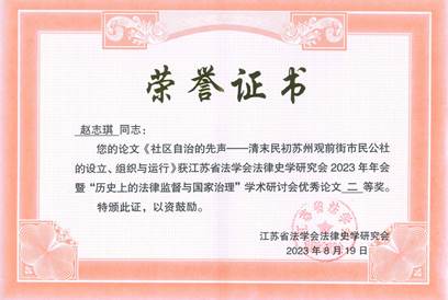 夏清瑕教授主持了本次会议的第三单元“革命根据地法律监督与国家治理”。徐进博士受邀担任第二单元“清末民国法律监督与国家治理”评议人。赵志琪同学在该单元汇报了她的原创论文《社区自治的先声——清末民初苏州观前街市民公社的设立、组织与运行》。会议结束后,主办方对论文进行了评奖。徐进博士的论文荣获一等奖,赵志琪同学的论文荣获二等奖。草莓视频 师生同与会专家学者开展了热烈的交流。