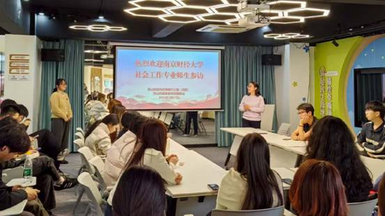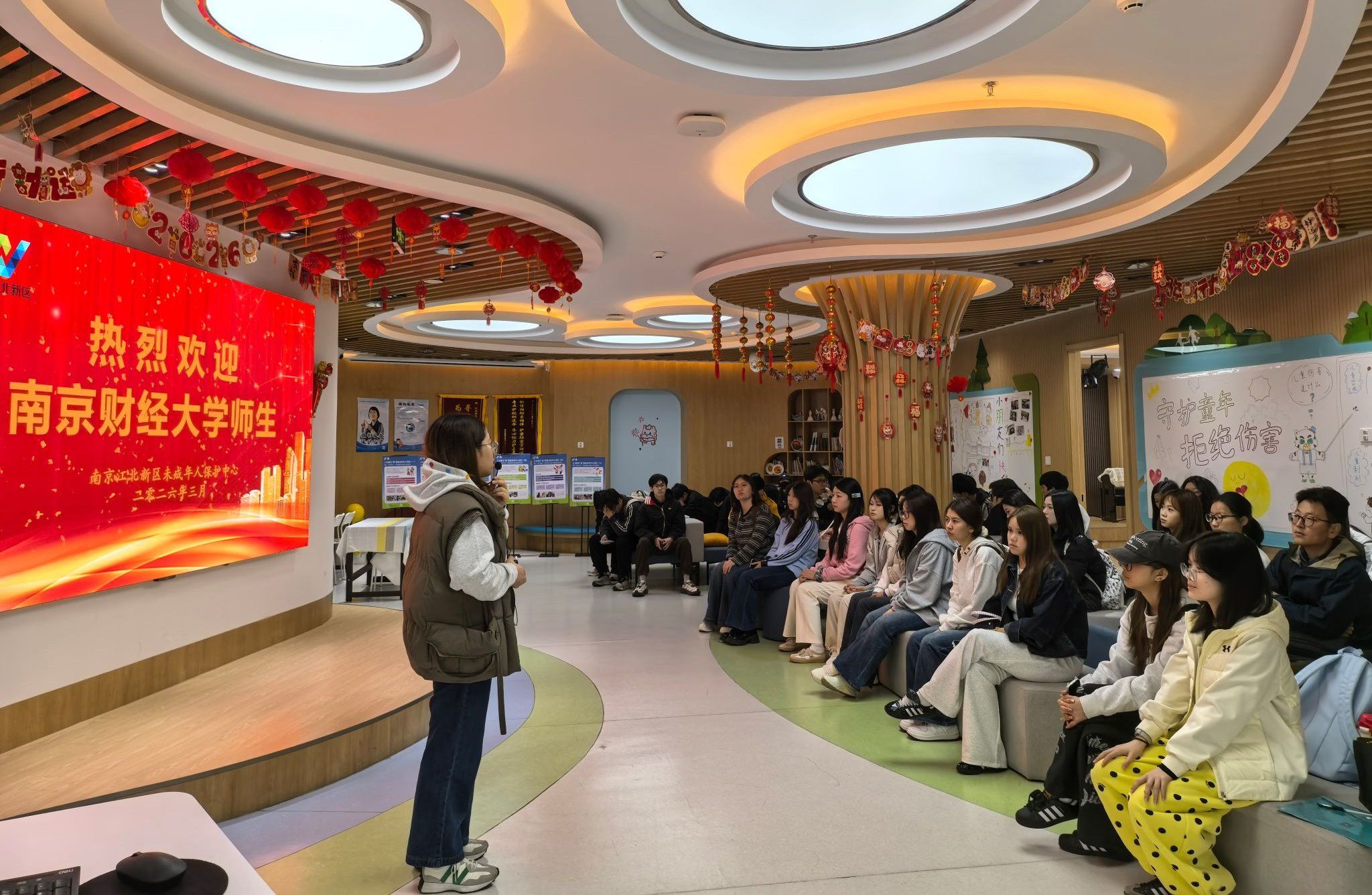 参访首站来到江北新区未成年人保护中心。该中心由南京同心未成年人保护与服务中心运营,2022年9月建成投用,内设儿童服务区、图书角、法治帮教区等功能空间,面向辖区困境、留守、流动儿童提供健康体检、心理疏导、女童保护、司法帮教等多元服务。社工李欢、雷妤围绕未成年人保护政策、阵地运营、公益项目、志愿见习岗建设等内容进行细致讲解,并分享江北新区原创公益歌曲《为爱护航,江爱唱响》,让草莓视频 师生全面了解未成年人保护工作体系与服务模式,现场还发出实习邀请,鼓励同学们投身一线未成年人保护实践。
