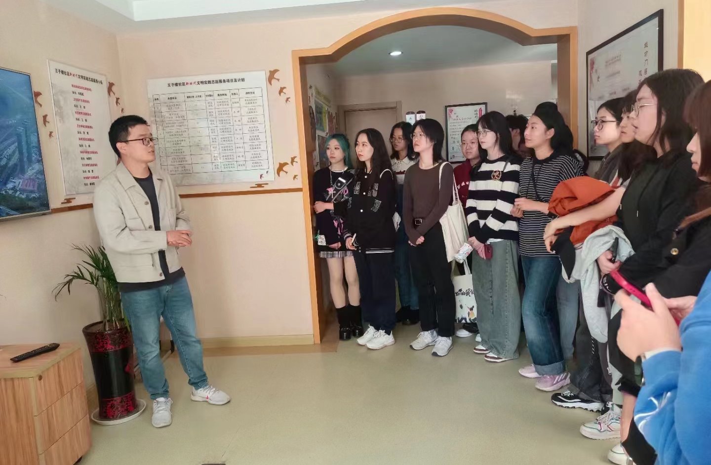 第二站师生们来到了姚坊门居家养老服务中心王子楼站点。魏应保老师向同学们详细介绍了中心的工作以及养老互助服务的相关情况。同学们观看了姚坊门居家养老服务中心的宣传视频,对居家养老方面的知识有了一定的了解。接着,同学们完整参观了养老服务中心的各个功能区,分别有足疗疗养区、电视电影区、阅读区、医疗服务区等,不仅满足老年人在身体健康方面的需要,更满足不同老龄段群体的精神需求。魏应保老师介绍道,现在居家养老模式是养老服务的主流,社区会通过购买服务或者志愿服务的方式,上门为失能老人提供助浴、打扫卫生等生活服务,在养老中心还会有理发师、志愿者和社工定期帮助老人理发、开展活动、和老年人一起读书,给老人提供了很多便利和丰富多彩的日常生活。“时间银行”概念的提出和运行得到了老年人的普遍欢迎,不仅能够享受到多样化、多元化的养老服务,还能通过“时间银行”的储蓄兑换生活用品和物资,可谓是真正做到了康养结合,注重身体健康和精神健康并重,更好地服务老人,让老年人度过丰富多彩的退休养老生活。