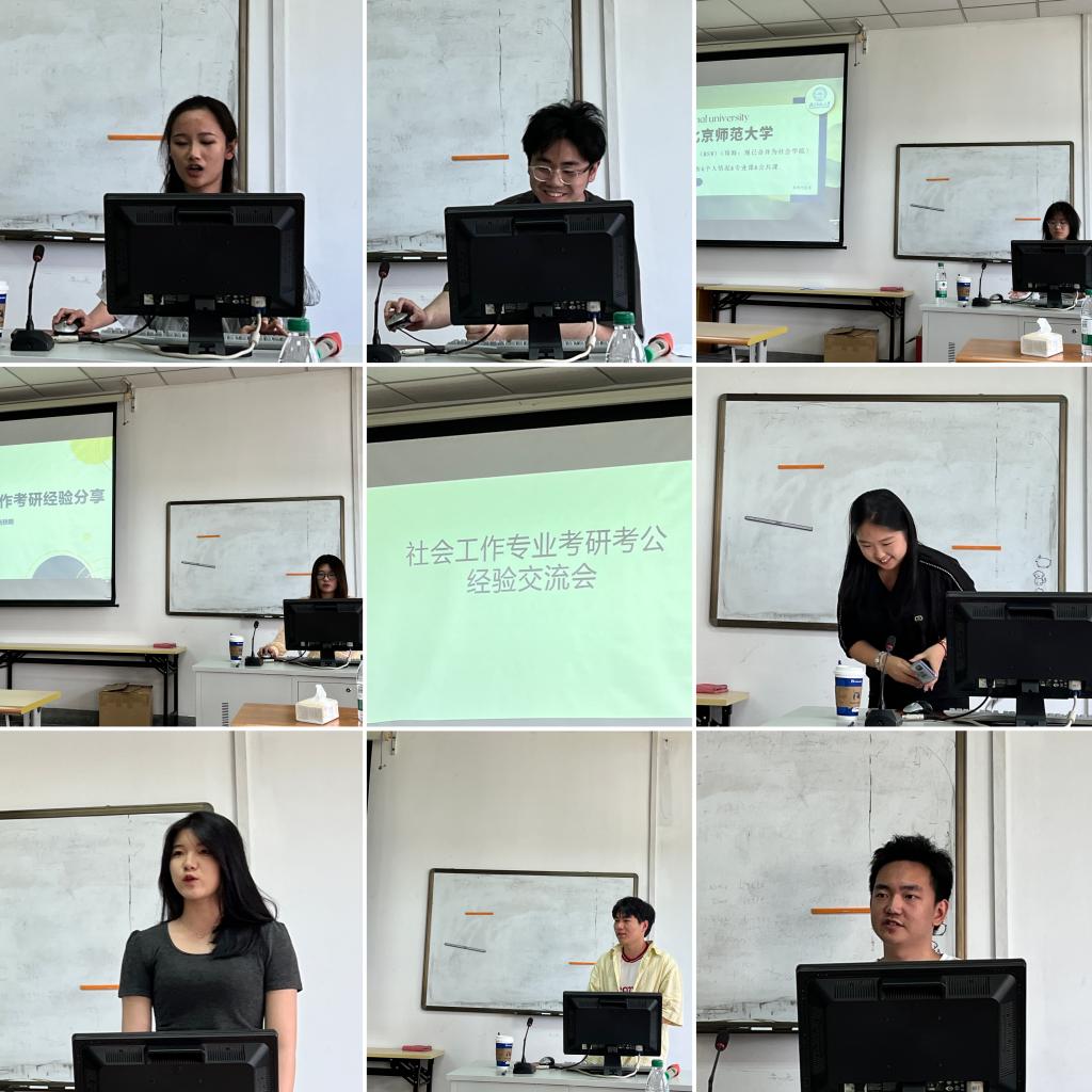 分享会从艳阳高照一直进行到日光西垂。7名考取了211、985院校研究生的同学与1名考取了公务员的同学详细分享了自己的奋战经历。“上岸”华东理工大学的徐韵祯同学第一个分享,一开始便说自己一年的备考如同“过山车”,从和家人们商量考研、考公还是出国到确定考研目标开始努力,再到最后“上岸”中间经历了很多很多;甚至寒假还去准备了事业编考试,没想到最终获得了成功。“只要坚持下来,就已经是一次成功。”汪雨柯作为大二转专业进入社工系的同学,也成功“上岸”南京师范大学,他详细分享了备考政治、英语公共课的方法,讲述着自己“符号记忆法”的独特技巧——要将英语单词融入生活和兴趣场景中记忆。