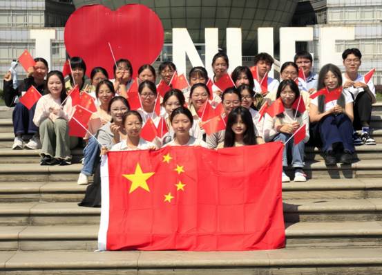 在图书馆中心广场,灿烂的阳光落在五星红旗上,也洒在青年人朝气蓬勃的脸上。活动中,同学们分成小组,用青春的视角,新颖的方式,拍出一张又一张与五星红旗的合影。