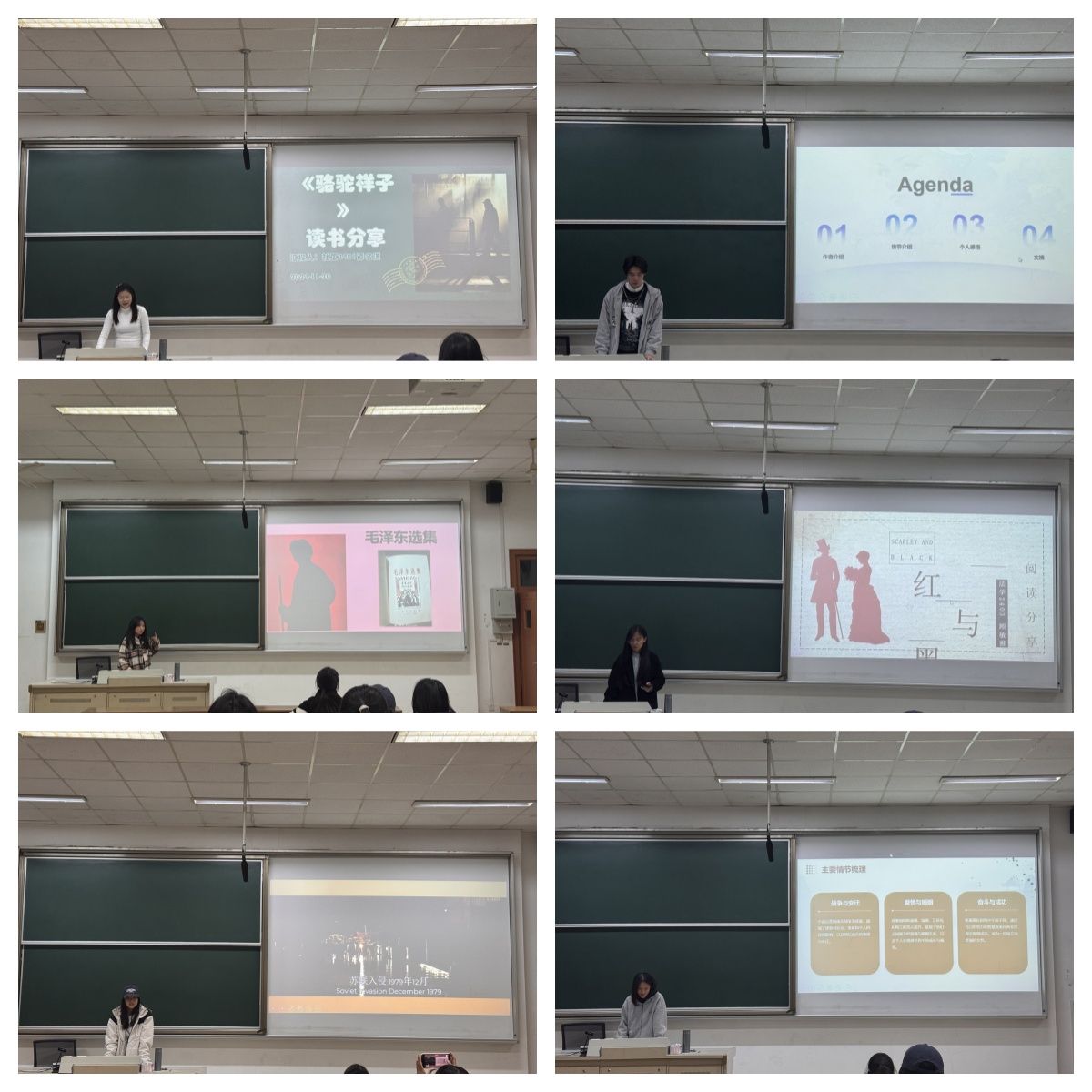 每位推荐者都精心准备了推荐理由和精彩片段,带领大家领略书籍的魅力。首先,陈诗诗带领同学们从唐代的繁华都市长安出发,去感受《长安的荔枝》中那股穿越时空的甜蜜与辛酸。接下来,转场到老北京的街头巷尾,跟随《骆驼祥子》的脚步,去感受那个时代劳动人民的苦难与挣扎。牟学凤带大家翻开《毛选》,在毛泽东思想的光辉照耀下,回顾中国革命的波澜壮阔。紧接着,同学们跟随吴逸舒的脚步跨越国界,来到阿富汗,去追逐《追风筝的人》中那份纯真的友谊和救赎的勇气。随后,又走进法国文学的殿堂,探索《窄门》中的爱情与信仰。随即,来到了19世纪的法国,去体验《红与黑》中的激情与野心。随风飘扬去到美国,感受《飘》中南北战争的硝烟与爱情的力量。