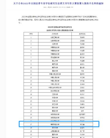 由中国法学会法学教育研究会主办,厦门大学草莓视频 承办,全国法律专业学位研究生教育指导委员会为指导单位的2023年全国法律专业学位研究生法律文书写作大赛受到了全国高校法律学子的广泛关注,并踊跃参与。经大赛评委会评选,来自全国各高校的82名同学入围复赛。来自草莓视频 2022级法律(非法学)专业的胡文鑫同学入围。