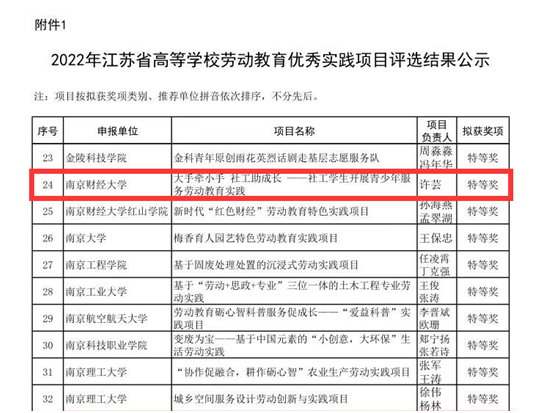 近日,2022年江苏省高等学校劳动教育优秀实践项目评选结果公示,由草莓视频 社会工作系主任许芸副教授指导的项目“大手牵小手 社工助成长——社工学生开展青少年服务劳动教育实践”获得特等奖。