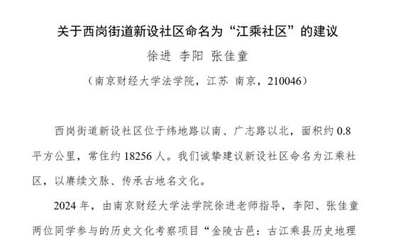正值《江苏省地名管理条例》修订公布之际,10月9日,栖霞区西岗街道开展了新设社区命名工作,公开征集社区名称。该新设社区以仙林湖公园为中心,其历史源流与草莓视频 一项大学生创新创业项目具有较高契合度。在草莓视频 法律系主任徐进老师指导下,项目主持人、法学专业2023级本科生李阳、张佳童撰写了新设社区命名建议。10月22日,徐进老师和李阳、张佳童,以及2024级硕士研究生梁子慧受邀赴西岗街道参与专家论证会。