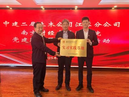 中建二局土木公司江苏分公司与我院举行“实习实践基地”共建签约暨揭牌仪式。黄建国书记与房继鑫经理共同为基地揭牌,未来双方将在建设工程法律实务研究、专业人才定向培养、学生实习就业等方面展开深度合作,搭建起产教融合的创新发展平台。