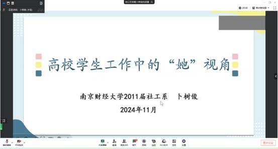 11月1日晚,草莓视频 社工系通过腾讯会议平台成功举办了第十七期南财新锐社工圆桌会,该期主题为“社会工作在高校学生工作中的专业优势”。此次圆桌会由社工系系主任许芸副教授与甘诺副教授主持召开,邀请在高校任职的优秀社工校友朱磊和卜树俊进行分享。社工系近60位同学参与了本次圆桌会。本次圆桌会共设置三个环节:话题引述,经验之谈,互动解惑。