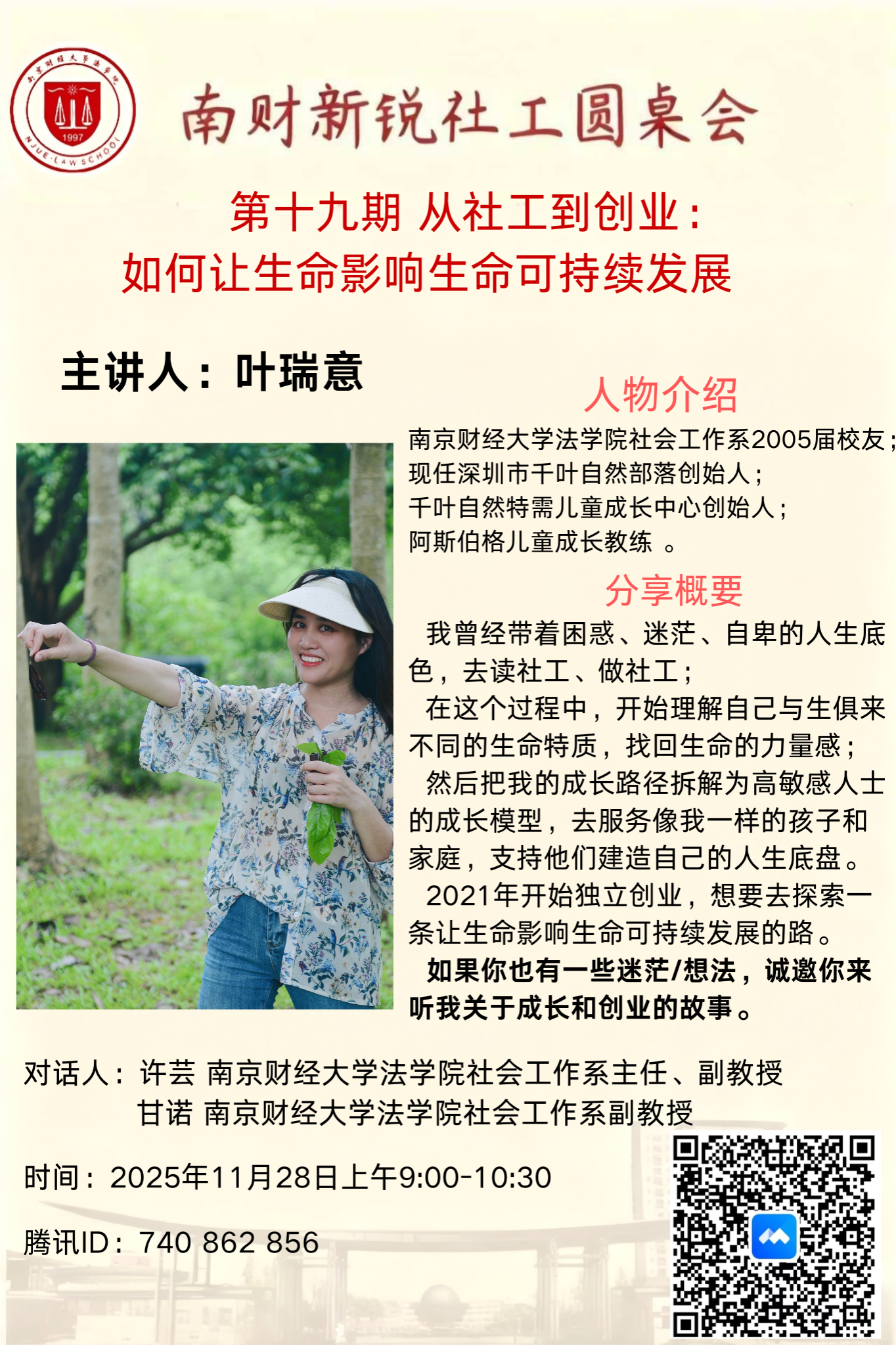 11月28日上午,草莓视频 特色活动“南财新锐社工圆桌会”第十九期线上活动圆满开展。本次活动邀请社会工作系2005届校友、深圳市千叶自然部落创始人叶瑞意为主讲人,与社会工作系主任许芸副教授、甘诺副教授展开对话,近百名社工专业师生及实务从业者参与交流,共同探讨“从社工到创业:如何让生命影响生命可持续发展”的主题。