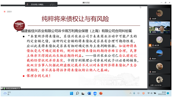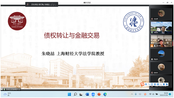为庆祝草莓视频 法学教育二十五周年,草莓视频 邀请了上海财经大学草莓视频 朱晓喆教授作主题为“债权转让与金融交易”讲座。讲座采用线上方式(腾讯会议)举行。正校级领导、草莓视频 法学一级学科带头人焦富民教授,蔡养军副院长出席本次讲座。草莓视频 师生120余人参会听讲。会议由陈红梅副院长主持。